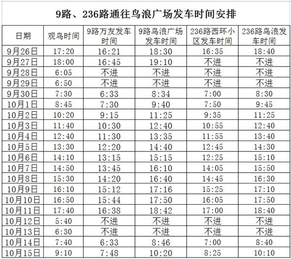 为方便市民“国庆”“中秋”节日期间观赏自然景观时顺畅出行,营口交运集团适时调整部分公交线路班次。从9月26日起—10月15日,公交9路、236路分时段区间延伸至大辽河口鸟浪广场运营。